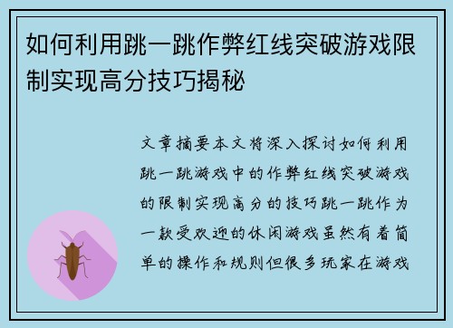 文章摘要:本文将深入探讨如何利用跳一跳游戏中的作弊红线突破游戏的限制,实现高分的技巧。跳一跳作为一款受欢迎的休闲游戏,虽然有着简单的操作和规则,但很多玩家在游戏过程中都会遇到得分难以突破的瓶颈。本篇文章通过分析游戏机制和技巧,揭示了四个关键方面:作弊红线的工作原理、如何通过外部工具突破限制、精确操作技巧的提升方法以及如何在实际游戏中应用这些技巧。每个方面都会结合具体的步骤和案例,帮助玩家们突破高分瓶颈,体验更加刺激的游戏乐趣。通过这些技巧的运用,玩家可以大幅度提升得分,并挑战游戏的极限。